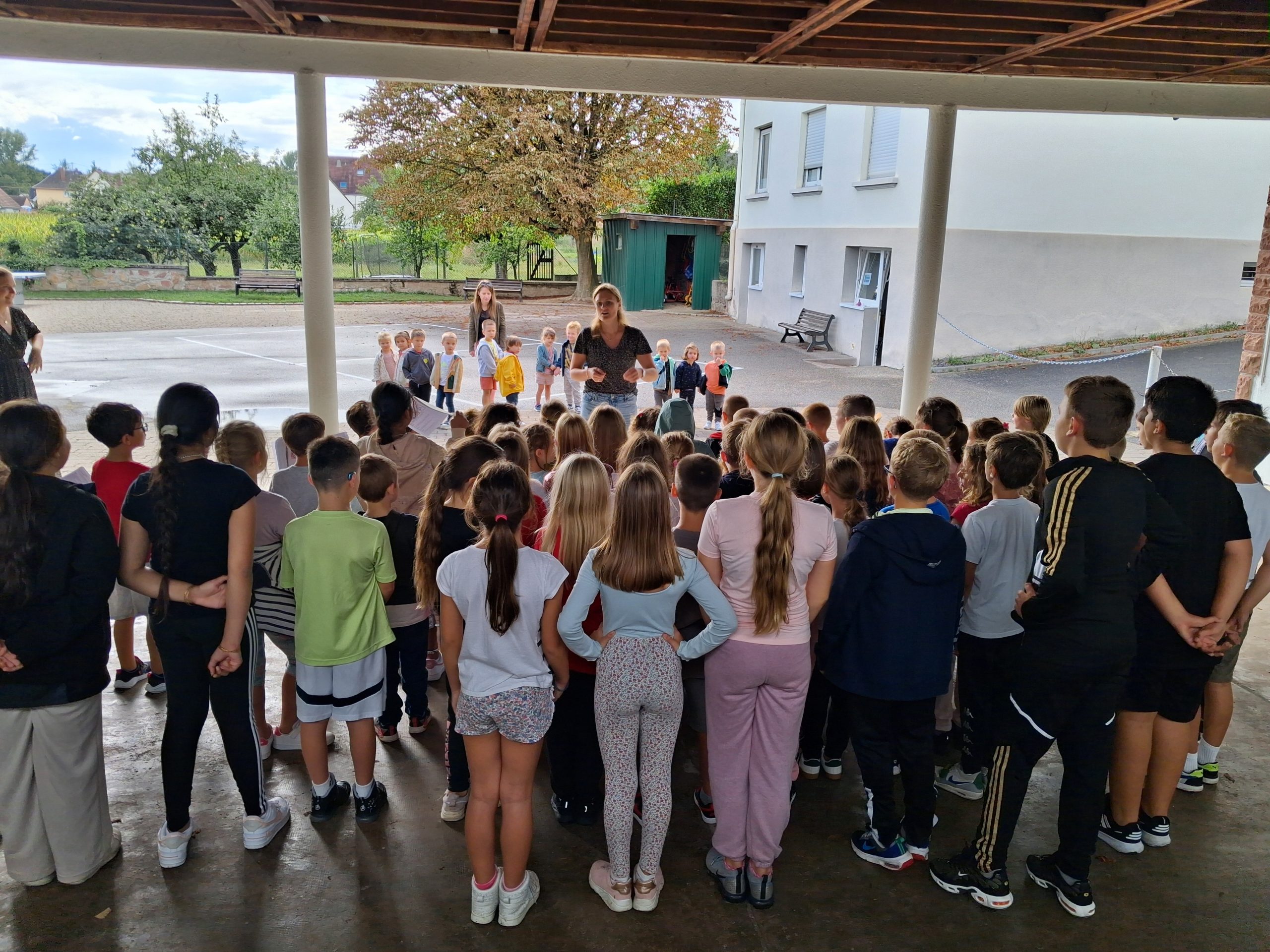Ils se sont réunis sous le préau pour interpréter le chant « C’est la rentrée ».